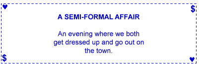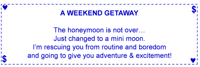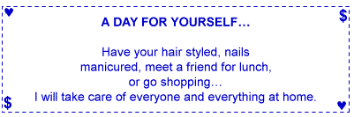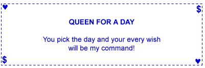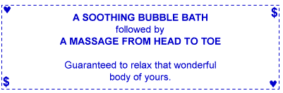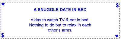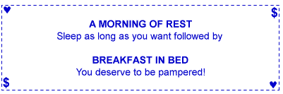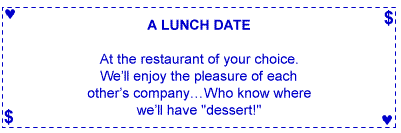 Give the coupons to your mate and tell her, "More valuable than money is my gift of love to you. These coupons are redeemable whenever your heart desires!"